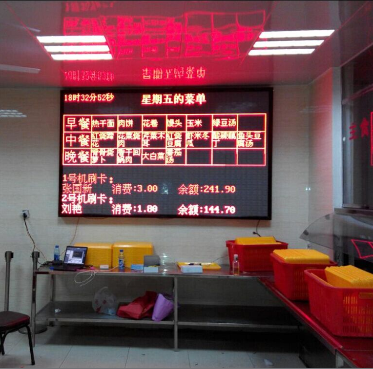 武漢市城管執(zhí)法督查總隊采用我司LED顯示消費機,結(jié)合大屏LED顯示屏,員工在消費機上刷卡消費,立即反饋到大屏LED顯示屏上,顯示刷卡人信息,刷卡者在幾號卡機刷卡消費,消費金額等信息以滾動形式體現(xiàn),同時大屏LED顯示屏可顯示當天每餐的菜式。