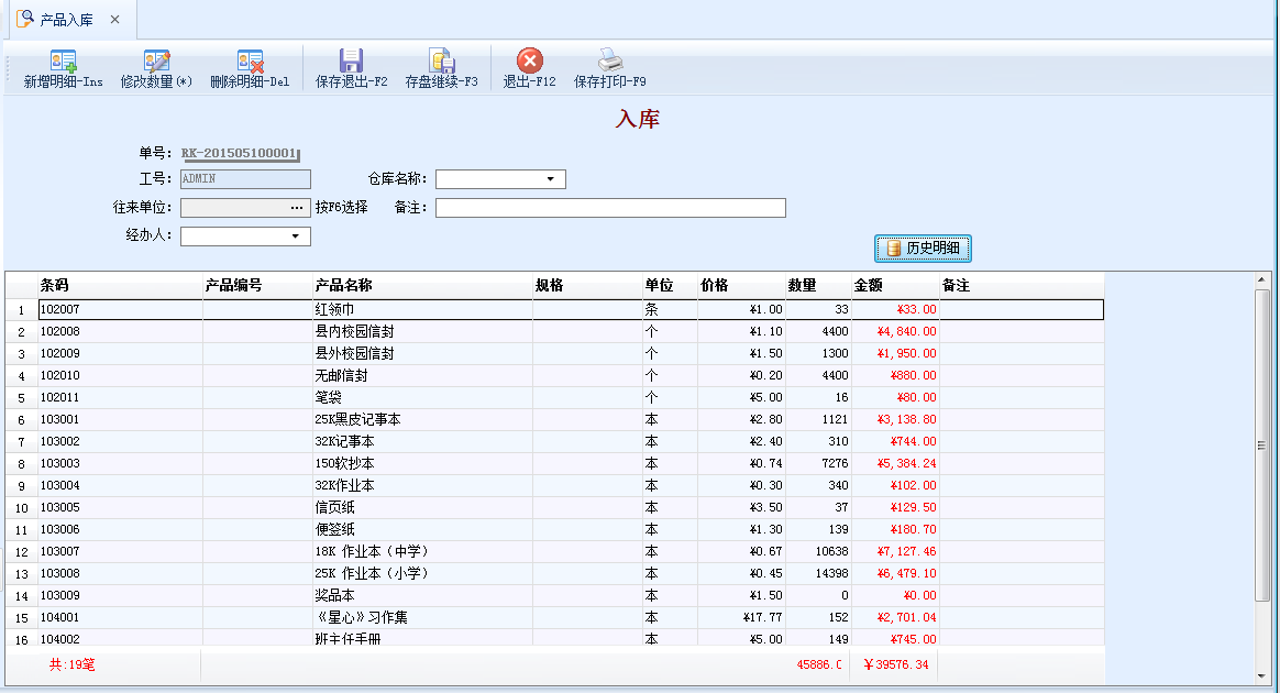 6.產(chǎn)品入庫:將采購進(jìn)來的商品、原材料、低值易耗品進(jìn)行入庫??蛇x擇不同倉庫。