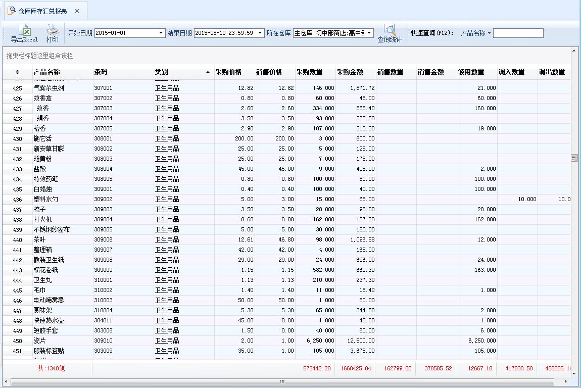 11.倉庫庫存匯總報(bào)表:匯總統(tǒng)計(jì)每個(gè)倉庫的每種產(chǎn)品的各種操作的合計(jì)。