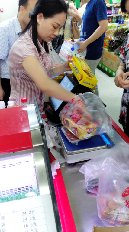 13.實(shí)際收銀效果:一名收銀員就能簡單的完成掃條碼、稱重的復(fù)雜操作。