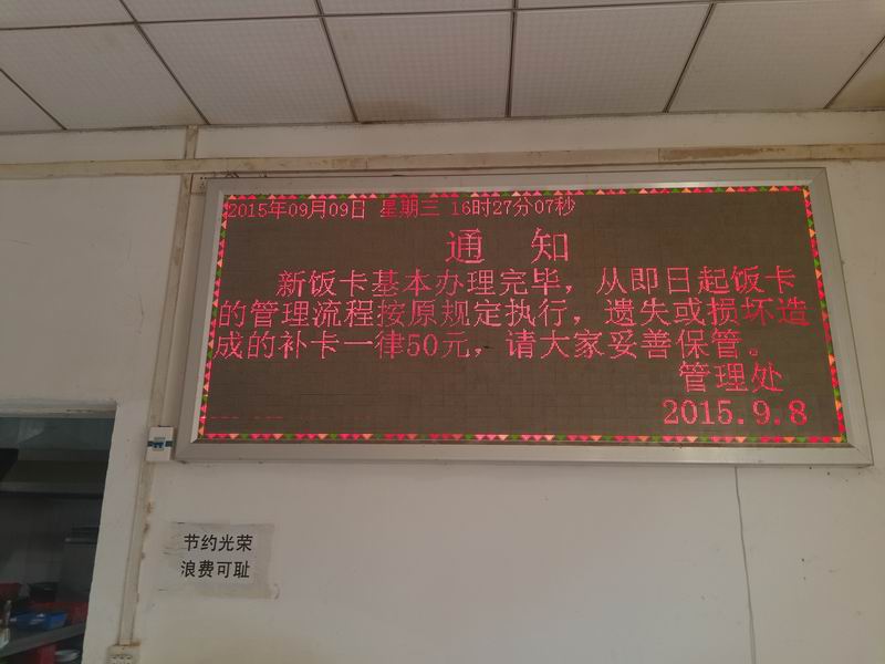 該單位與2015年8月16日安裝我公司食堂消費管理系統(tǒng),完美的解決了以前因消費系統(tǒng)功能不完善而造成的賬目混亂、消費次數(shù)無法控制而造成的糧食浪費、刷卡系統(tǒng)不穩(wěn)定而造成員工無法刷卡進餐的諸多問題,LED屏幕也經(jīng)我公司維修后正常投入使用。