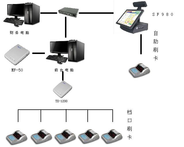 2.收銀部分:圖中所指的是前臺(tái)電腦部分,主要功能是發(fā)卡之類的日常操作以及收銀數(shù)據(jù)的收集以及查詢統(tǒng)計(jì);