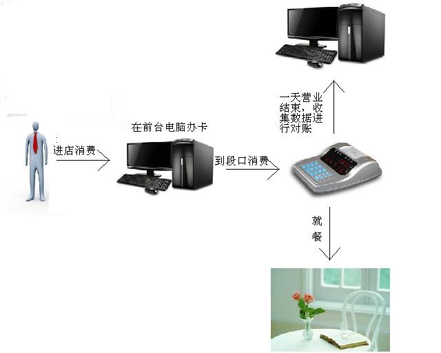 3.檔口營(yíng)業(yè)部分:圖中所指的是檔口POS機(jī),主要實(shí)現(xiàn)檔口銷售處理,通過(guò)銷售可以打印出銷售小票,并且將消費(fèi)卡中金額扣除。
