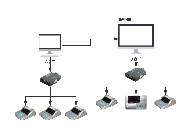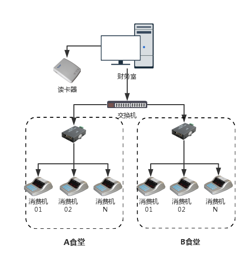 方案一:考慮到原有食堂存在著老設(shè)備以及卡片(IC卡),現(xiàn)就新食堂的建立重新采購一批新設(shè)備,為了節(jié)省成本,可以實現(xiàn)在不更換IC卡的前提下,實現(xiàn)我司研發(fā)的雙模消費機,只識別IC卡序列號,將IC卡當(dāng)作ID卡進行使用,由于新老食堂不在同一區(qū)域同時又能夠?qū)崿F(xiàn)一卡一庫,新老食堂電腦必須滿足能夠使用internet網(wǎng)絡(luò)(可以打開網(wǎng)頁,QQ),以新老食堂其中一臺電腦作為服務(wù)器,供其他地區(qū)食堂聯(lián)網(wǎng)刷卡消費。此方案優(yōu)勢在于,可不更換原有的IC卡,節(jié)省成本。弊端比較突出的在于由于是跨區(qū)寬帶,穩(wěn)定性不可控,并且服務(wù)器在新老食堂就餐的時間內(nèi)必須開啟,否則整個則不能使用。