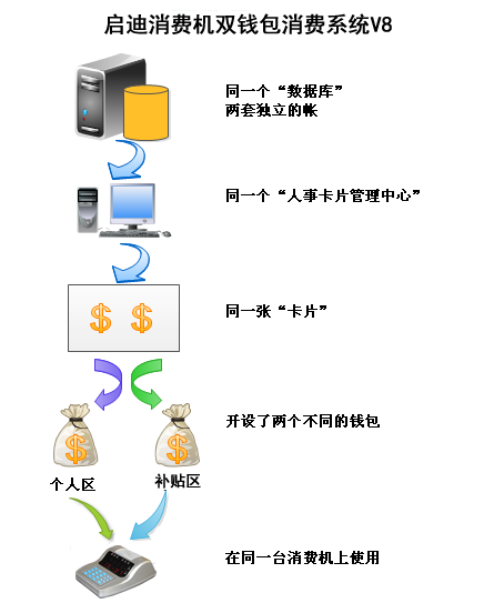 雙錢包是指在同一張卡、同一臺消費(fèi)機(jī)、同一套消費(fèi)軟件下實(shí)現(xiàn)兩個錢包賬戶的管理,分為補(bǔ)貼區(qū)和個人區(qū),補(bǔ)貼區(qū)具有按卡類每個月首次消費(fèi)自動清零,然后可使用自助補(bǔ)貼機(jī)自助補(bǔ)貼的功能,補(bǔ)貼區(qū)和個人區(qū)均有獨(dú)立的日限額、次限額功、刷卡間隔等限制功能,當(dāng)補(bǔ)貼區(qū)不符合交易條件時候,消費(fèi)機(jī)自動切換到個人區(qū)去扣款,補(bǔ)貼區(qū)和個人區(qū)在軟件上面是分兩套不同的賬目管理,等同把兩套原本獨(dú)立的消費(fèi)系統(tǒng)合并到了一套。