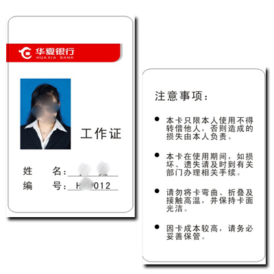 人像卡(工作證)是通過(guò)證卡打印機(jī)制作的個(gè)人資料的信息卡,將人像照、姓名、編號(hào)、圖像、姓名、編號(hào)、 圖像、條形碼及其它資料直接打印在PVC卡上,可以用來(lái)作各類工作牌、出入卡、胸卡、會(huì)員卡 、暫住卡、會(huì)員卡,貴賓卡,IC卡,ID卡,彩照信用卡、通行證等。